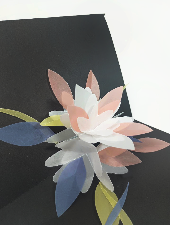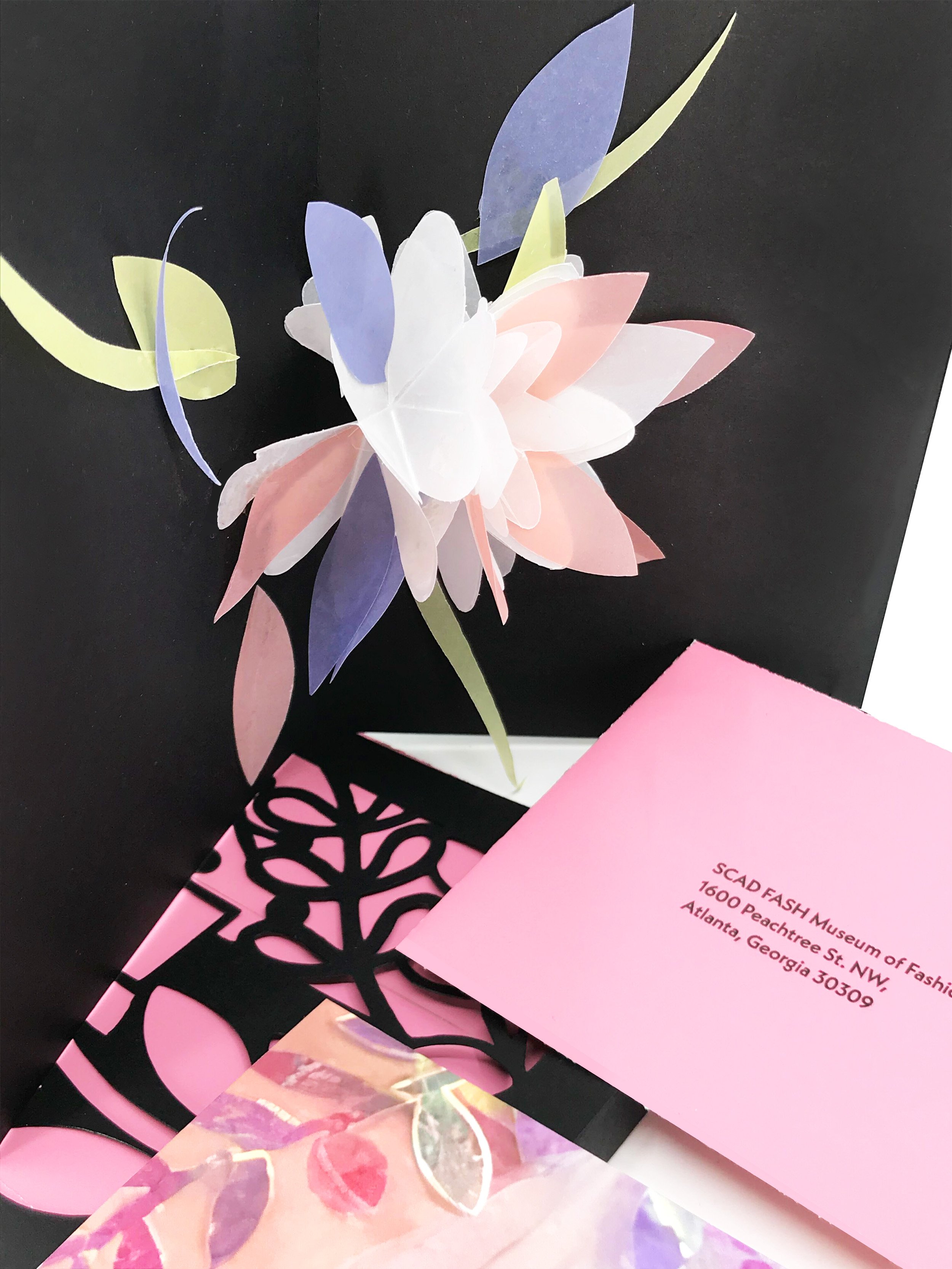 Christian Siriano celebrated his 15th anniversary as a fashion designer this past year. His Spring 2024 collection showcases a diverse line of fabrics, colors, and styles. Reconnecting with his first inspiration, Siriano brings the element of ballet to his work in an array of ribbon and tulle. The invitation features the florals draping down the dress and the foiling captures the iridescence. Close-up photos of the dress adorn the front cover and the reply card, showing off the details of the dress.